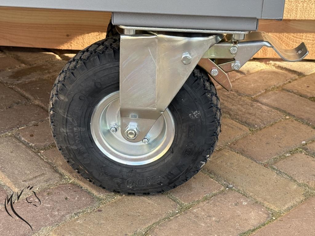 - Uitgerust met 4 wielen en luchtbanden (Ø260mm), 2 vast en 2 met zwenkwielen en rem (incl. lier oog)